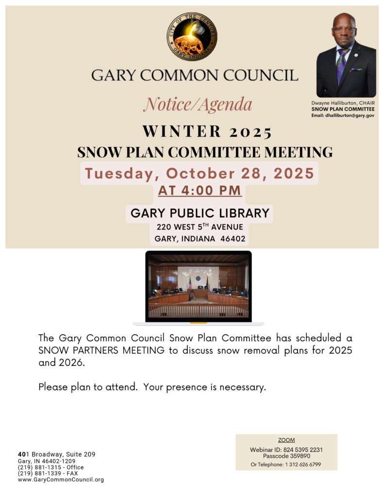 The Gary Common Council Snow Plan Committee has scheduled a SNOW PARTNERS MEETING to discuss snow removal plans for 2025 and 2026.