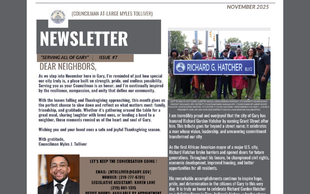 Newsletter | Serving All of Gary | NOV by admin@fakultydesign.com | Nov 17, 2025 | News & Updates, Newsletters | 0 comments Read the Latest by Councilman At-Large Myles Tolliver November 2025.NewsletterDownload Submit a Comment Cancel replyYour email address will not be published. Required fields are marked *Comment * Name * Email * Website Save my name, email, and website in this browser for the next time I comment.
